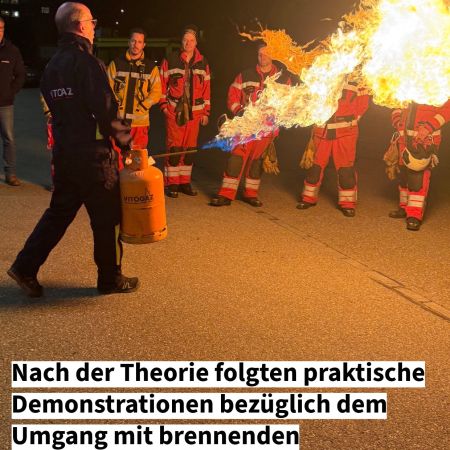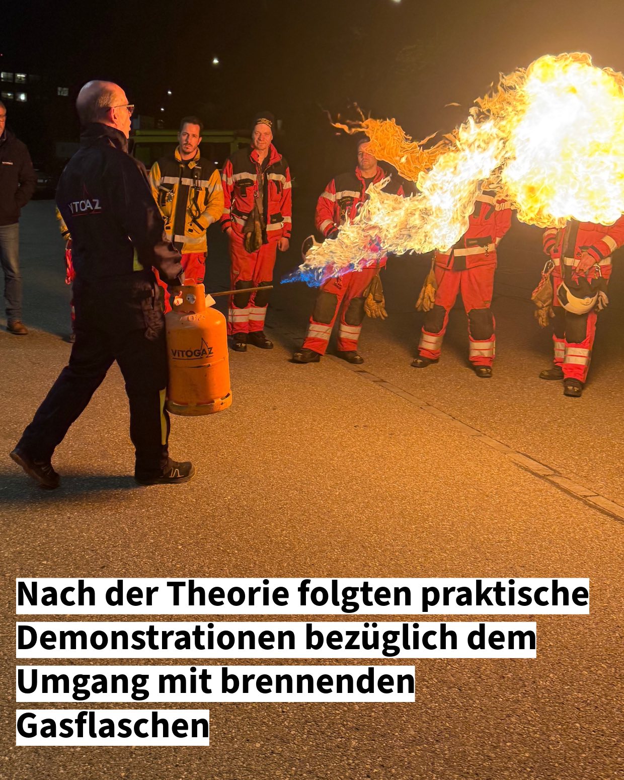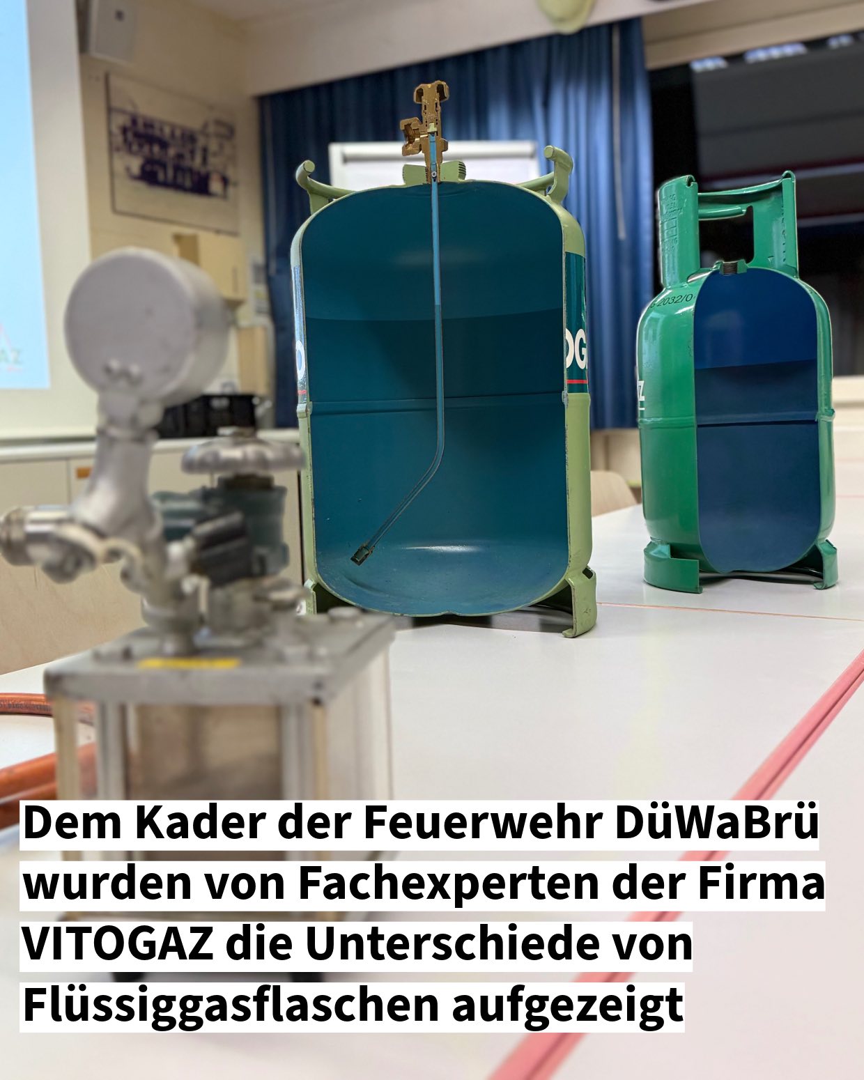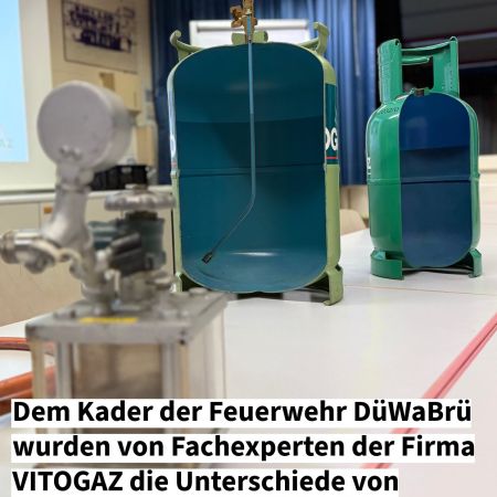 Um das Wissen des Kaders der Feuerwehr Dübendorf - Wangen-Brüttisellen bezüglich möglichen Gefahren von Gasflaschen im Einsatz, sowie dem sicheren Umgang und Lagerung von Gasflaschen aufzufrischen, durften wir zwei Mitarbeiter der Firma VITOGAZ an unserer November Kaderübung begrüssen. Die Fachexperten konnten anschaulich demonstrieren was die Funktion der verbauten Durchflussbegrenzer in den Flaschenventilen ist, wie eine Situation mit brennenden Gasflaschen im Einsatz schnell entschärft werden kann, sowie die zusätzliche Gefahr von Austritt des Gases in flüssiger Form.