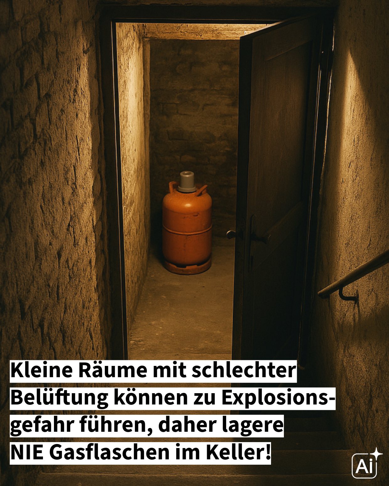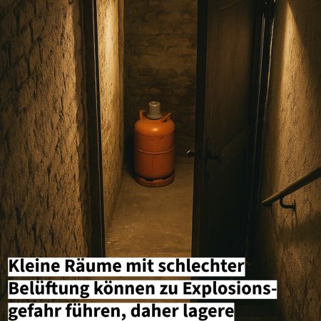 Keller sind oft schlecht belüftet. Tritt nun Gas aus einer undichten oder nicht vollständig geschlossenen Flasche aus, kann es sich schnell ansammeln und eine hoch explosive Atmosphäre bilden. Schon ein kleiner Funke, zum Beispiel beim Betätigen eines Lichtschalters oder einer Steckdose, kann eine verheerende Explosion auslösen.