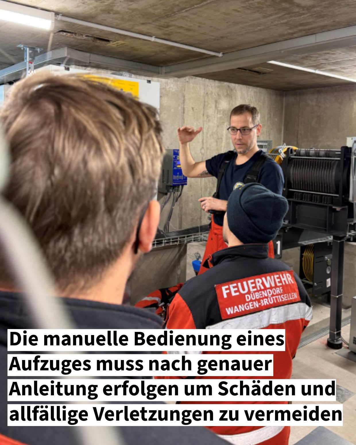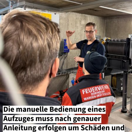 Neben der Brandbekämpfung befasste sich die Mannschaft auch mit der Rettung von eingeschlossenen Personen aus defekten Aufzugsanlagen. Um Aufzüge im Notfall manuell zu bewegen und eingeschlossene Personen zu befreien, müssen genaue Abläufe bekannt sein und klar befolgt werden. Nur so können Folgeschäden an der Anlage oder allfällige Verletzungen verhindert werden.