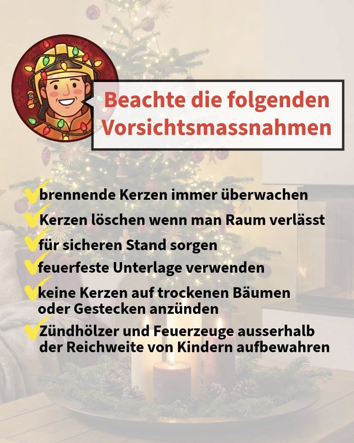 Der Kerzenschein gehört für viele von uns zur Weihnachtszeit einfach dazu, denn das warme Licht sorgt für Gemütlichkeit und Stimmung. Ein Adventskranz oder Weihnachtsbaum, der in einem warmen Zimmer steht, wird jedoch sehr schnell trocken. Und die trockenen Nadeln wirken, aufgrund der enthaltenen ätherischen Öle, wie Zunder. Ein kleiner Funke oder eine heruntergebrannte Kerze reichen oft schon aus, um das trockene Nadelholz explosionsartig zu entzünden. Ein solcher Brand entwickelt sich rasend schnell und setzt giftige Rauchgase frei. Um dies zu vermeiden, sollte man sicherstellen, dass die Bäume genügend Wasser erhalten und der sichere Umgang mit Kerzen bekannt ist: