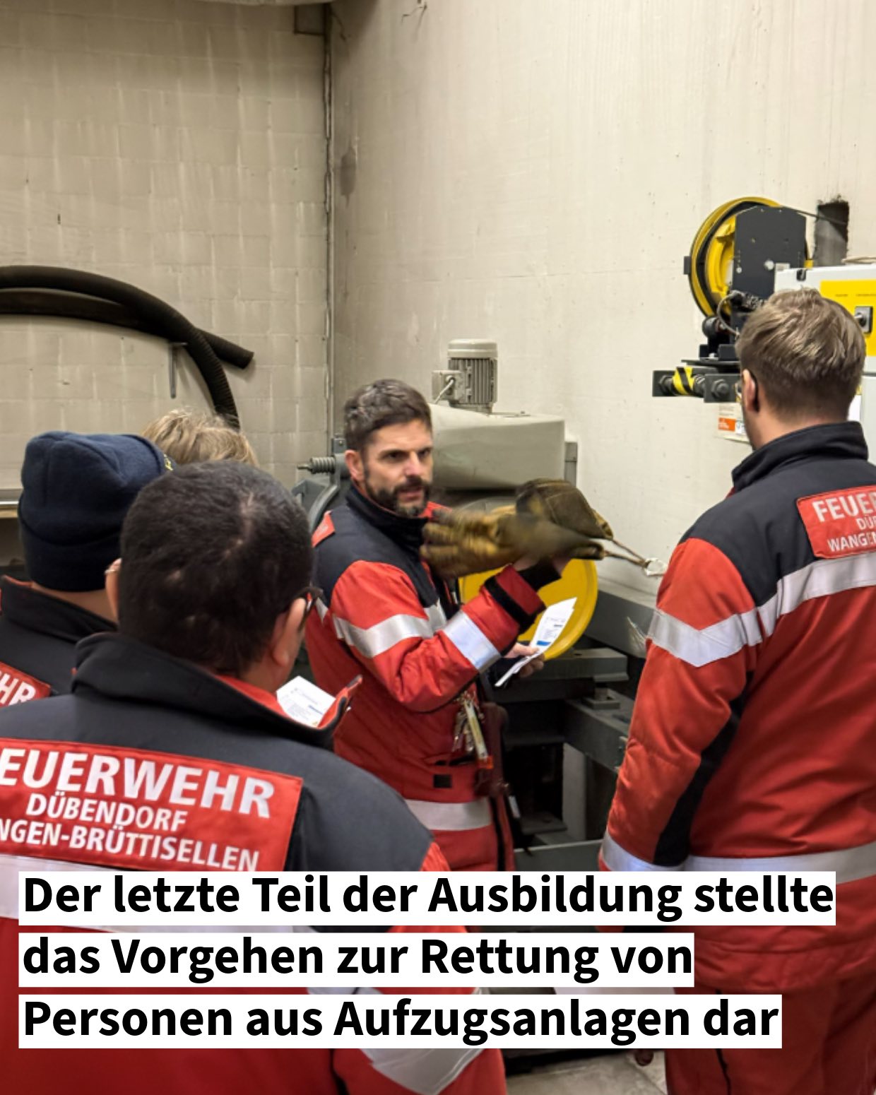 Neben der Brandbekämpfung befasste sich die Mannschaft auch mit der Rettung von eingeschlossenen Personen aus defekten Aufzugsanlagen. Um Aufzüge im Notfall manuell zu bewegen und eingeschlossene Personen zu befreien, müssen genaue Abläufe bekannt sein und klar befolgt werden. Nur so können Folgeschäden an der Anlage oder allfällige Verletzungen verhindert werden.